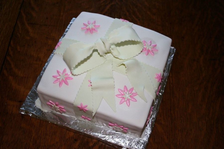 Here's a cake I did with a fondant bow and accents. White chocolate filling and crumb coated in white chcoloate icing.