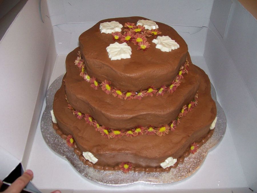 THis is a wedding cake I did for my friend... all I did was the deco, she baked and everything! All in all, it was a pretty sweet deal! She provided the flowers, the boards, the chocolate leaves and the cake. I did the icing :D
