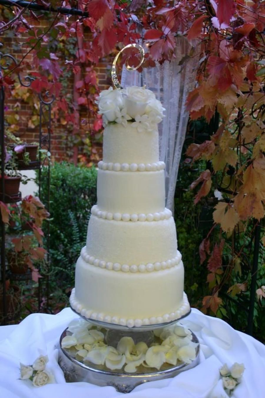 BC/rosette icing. Sugar crystals on 2 tiers, hand rolled fondant balls painted with a pearl dust shimmer. Almond cake with cream cheese filling, Carrot cake with cream cheese filling, Chocolate cake with a light chocolate bc filling, white cake with rasp filling. We used the melvira method to make this look so smooth, the wedding coordinatorand the florist thought it was fondant! WOO HOO!