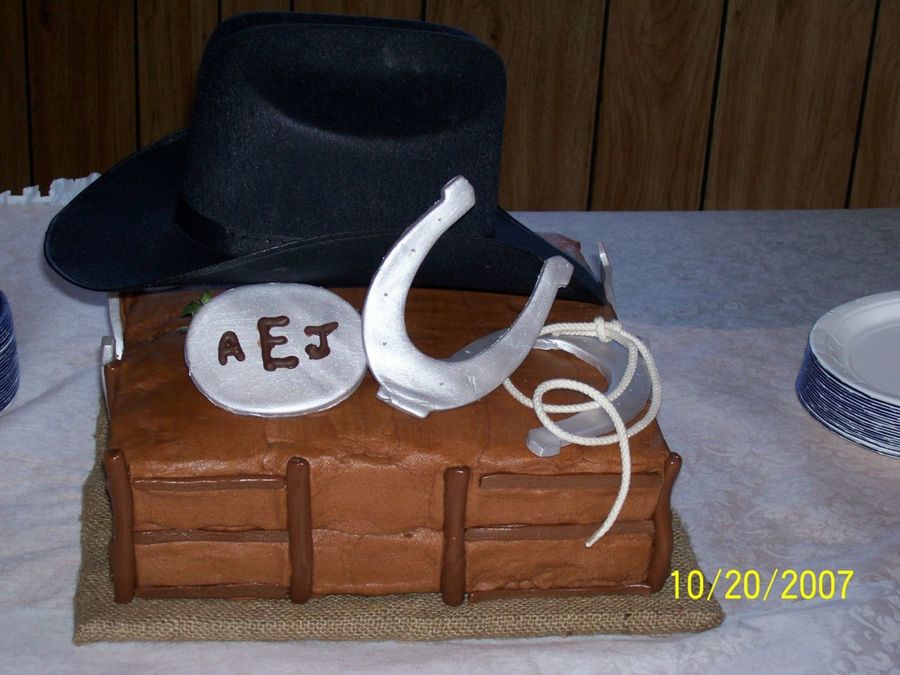 This is the grooms cake my sister and I made to go with Amber's wedding cake. This one was my favorite to do and I had so much fun doing it. The hat is real, the horseshoes and belt buckle are made of fondant painted with luster dust and the fence on the side is made out of tootsie rolls. The groom loved it and so did the guest.