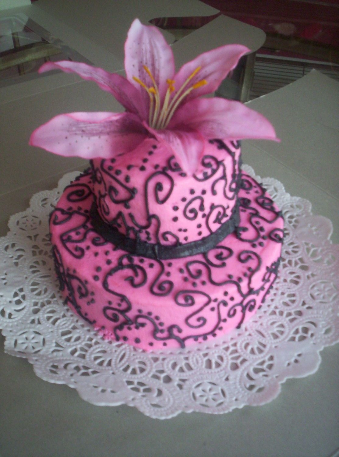 10 6 round. Buttercream with scrolls. Silver gumpaste roses