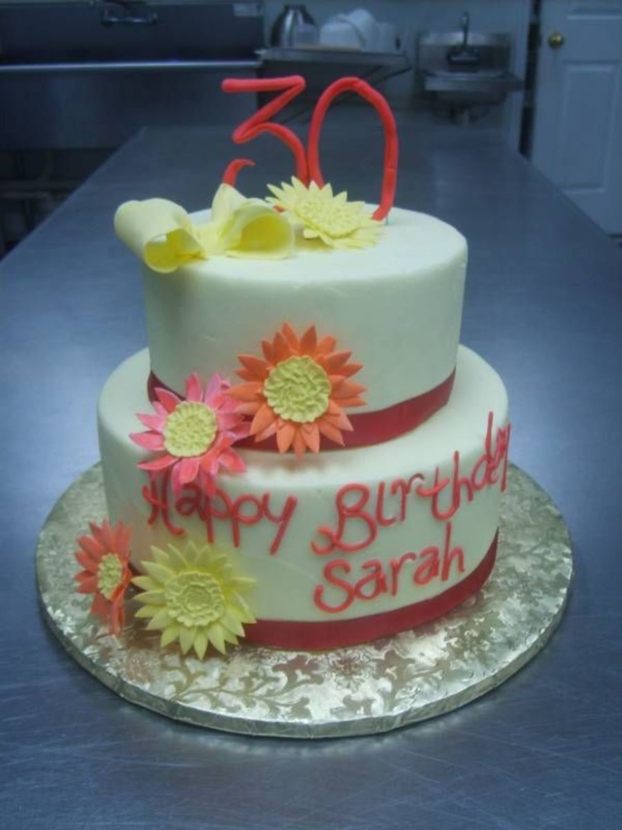 8-6 round. Yellow Buttercream. Gumpaste daisies and number 30. Fondant letters and ribbon.