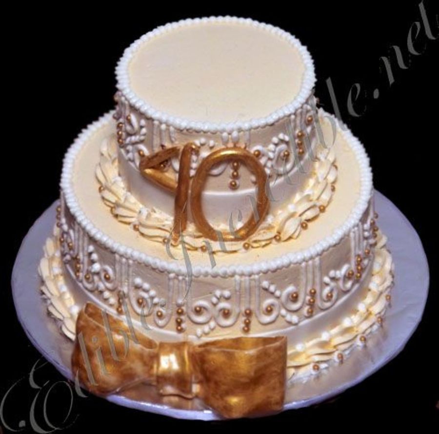 So this was a last-minute cake for my parents' 40th anniversary (oops). With the new baby and all, I just plain forgot until the night before. :( So, this is white cake with buttercream, a fondant ribbon and pearls, and gumpaste 40 and bow. I would have liked to have the 40 as a topper, but there simply wasn't enough time to let it dry. My parents LOVED it though, and that's all that matters. :) Thanks for looking!