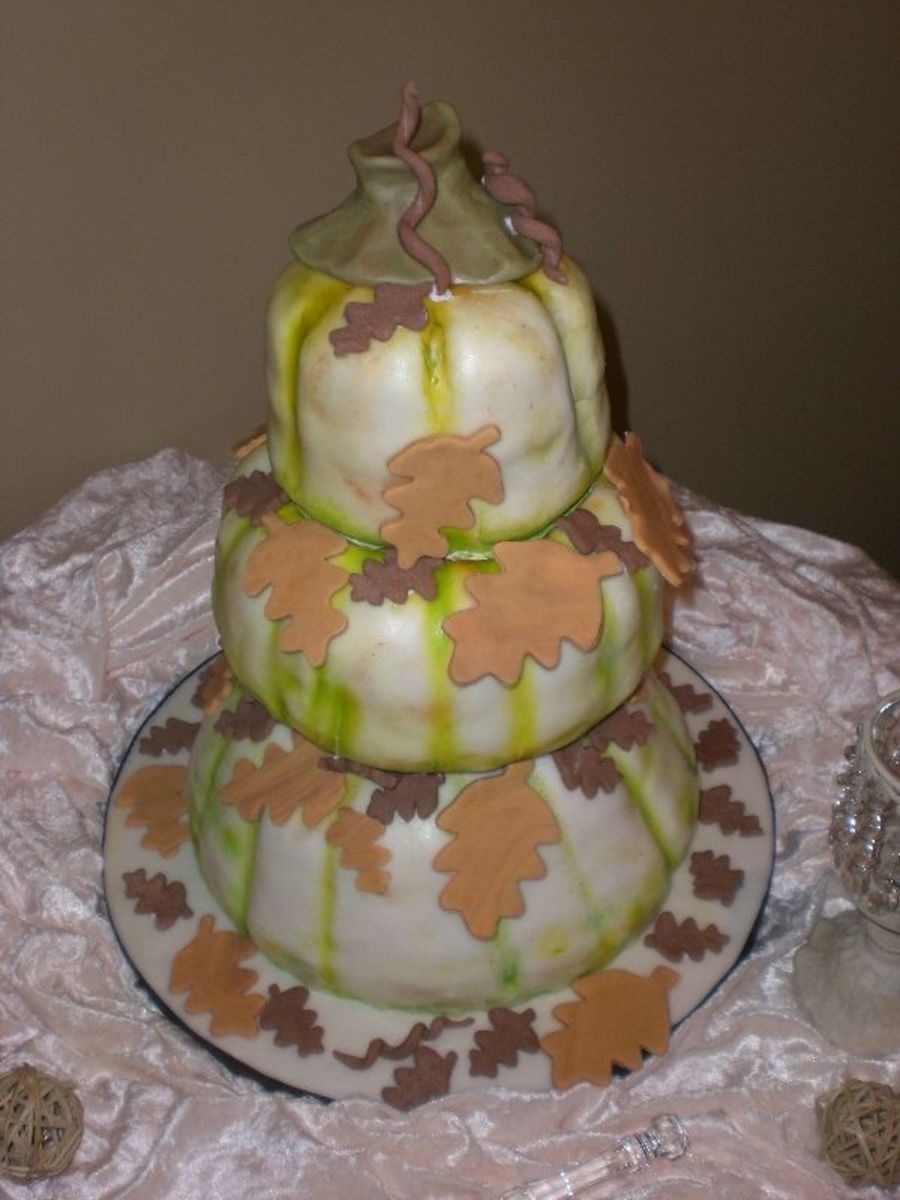 3 Tier Pumpkin Wedding Cake. Bride & Groom had me airbrush the cakes in yellow, brown & green with the vines. I had all of the fall leaves in every color that the bride asked for. Went to set up and they had me wash the entire cake to look like this and only use the color of leaves that you see. I was so mad! The original cakes looked great!