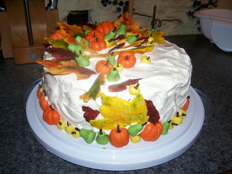 This is a yellow cake with cream cheese icing. The pumpkins, pears, and apples are made of fondant. The leaves are made of white chocolate.