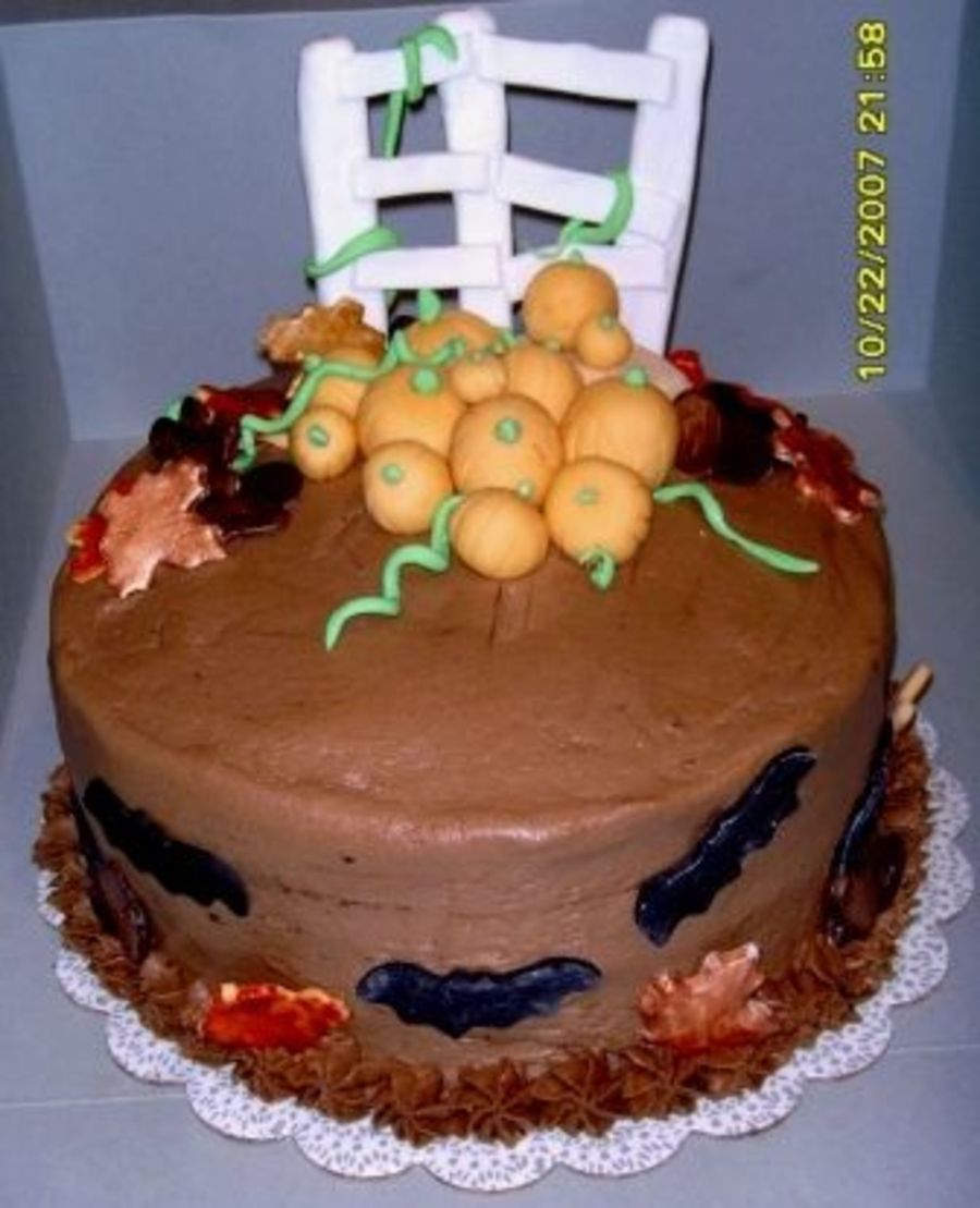 Chocolate and fall cakes, gotta love it. Your colors are perfect. Very nice fall leaves and pumpkins. You did a good job of carrying out the Halloween thenme by adding the bats. Good job.
