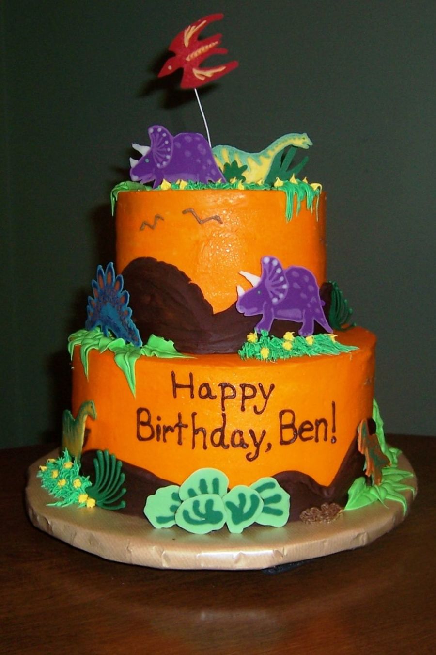 I made this cake to match a napkin with an orange background. The dinosaurs are chocolate and I wish I had made them bigger but the kids liked them!