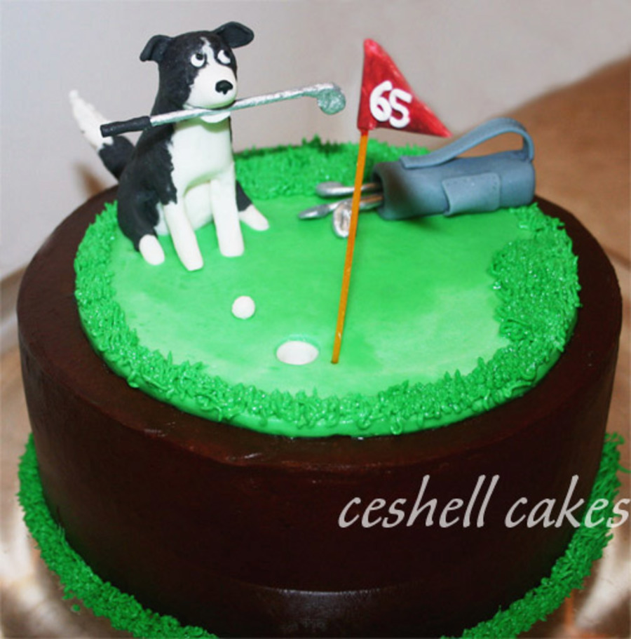 Golf-themed cake for a man's birthday whose other major interest is his border collie. Hazelnut cake with chocolate ganache buttercream. Buttercream grass marks my very first time using a piping bag (I chose the easy way out huh!) Accents are 50/50 fondant/gumpaste, but the big golf club has spaghetti inside for stability. Golf bag was modeled after one done by helipops (thanks!) The "crease" at the bottom of the cake is actually a reflection from the cake pedestal.