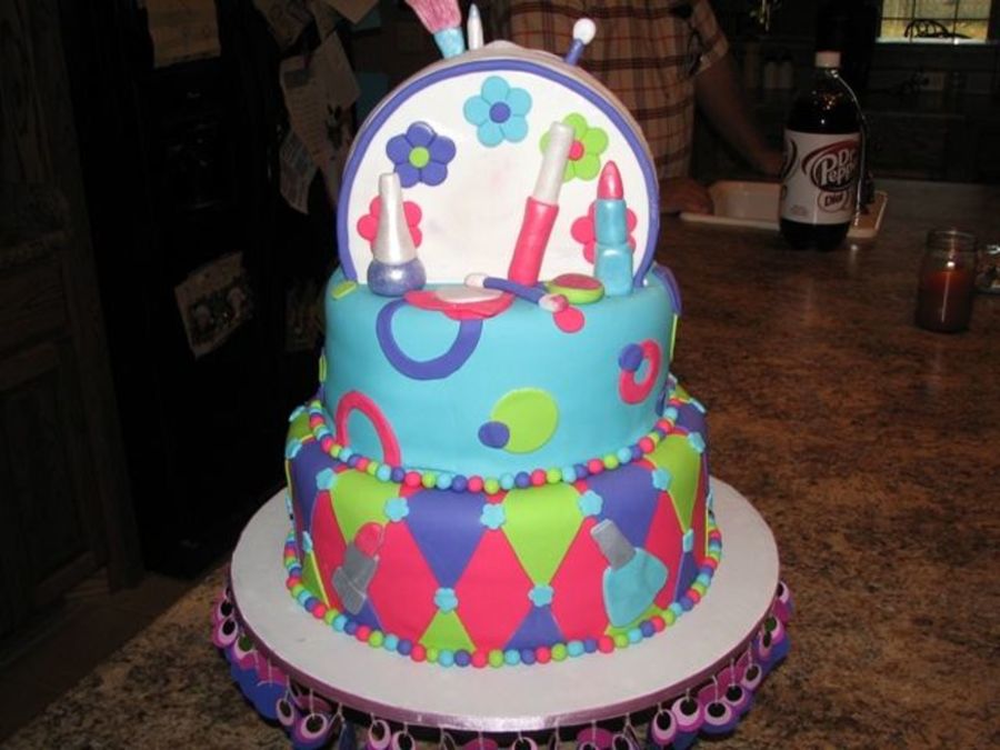 This is the cake I did for my twin nieces 7th birthday. They had a manicure/pedicure party, so I did this make-up bag cake. The make up bag is a cake I saw in a Debbie Brown book and have been looking for an excuse to make it. They had a small party and I went way over bord on the cake, but it was a good reason to practice with fondant. Besides, nothing is to good for my girls.