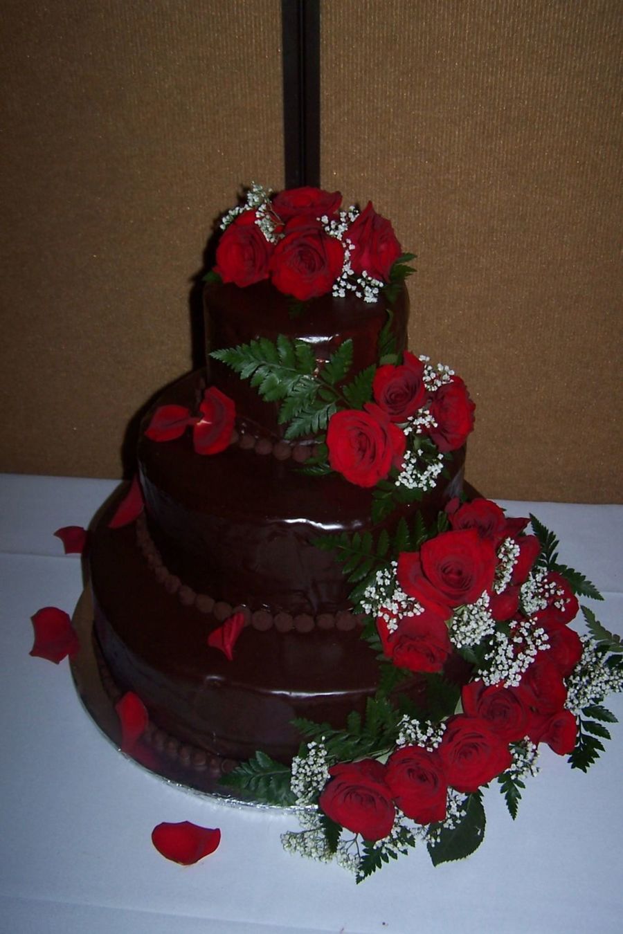 This was my first wedding cake. My sister forgot to order hers and didn't tell anyone til the week before the wedding. I covered the cake in chocolate ganache and used real roses.