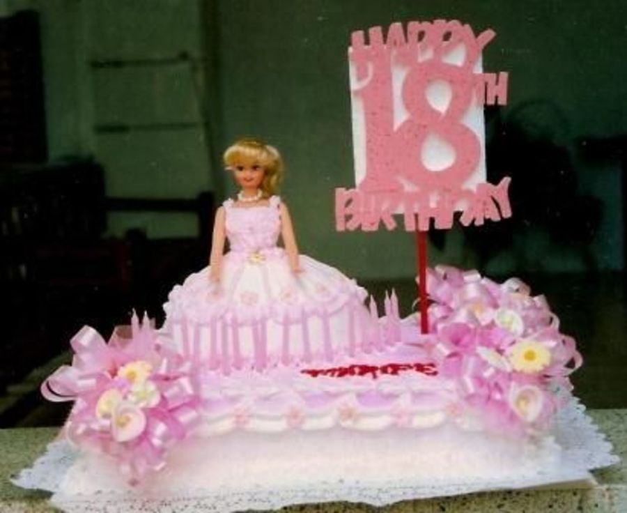 this is a 11x13 sheet cake. the dress of the doll is cake baked in a bowl. this is a debutante cake.