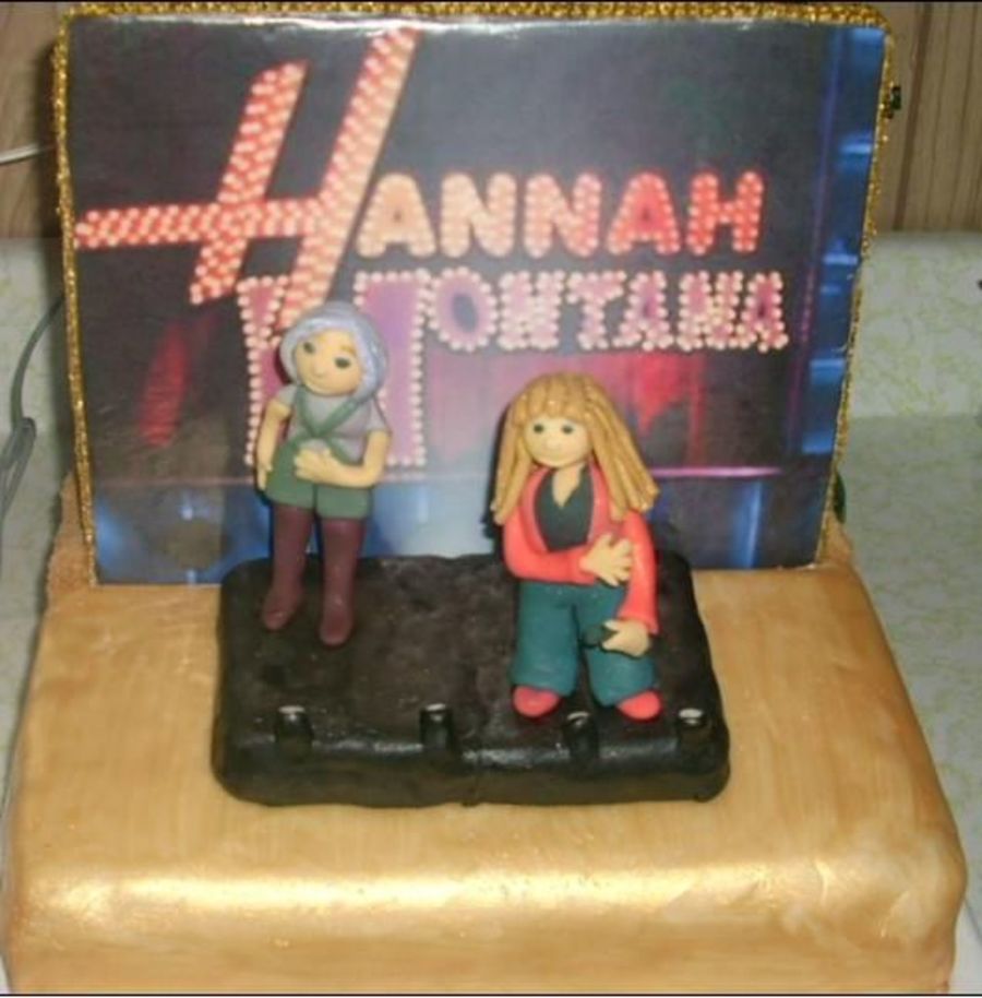This is the cake I've made for my daughter's 4th b-day. It's a Hannah Montana cake and it's in two sections. The front of the cake is Hannah and Lola on a stage. It's white modeling chocolate covering that side and painted with a gold luster. The stage is 2 rice crispy treats covered in white choc. tinted with black gel. There are close-up pictures of the figures in my photos under my profile. TFL