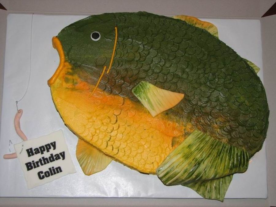 Thanks so much to Sweetpea8 for the idea for this cake. I think her cake looks soooo much better -she made it look alot easier than it really was! This is a yellow cake (CC's Super Enhanced Cake) with buttercream frosting. Fins, note and worm are made from fondant. This cake is for a friend's 5 year old's party tomorrow - hopefully it'll get there in one piece! Thanks so much for looking.