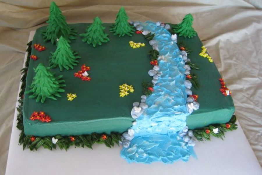 Engegament cake for two outdoor lovers. 1/2 sheet, white chocolate cake, raspberry cream cheese mousse filling & cream cheese icing. Tree's & rocks made with fondant.