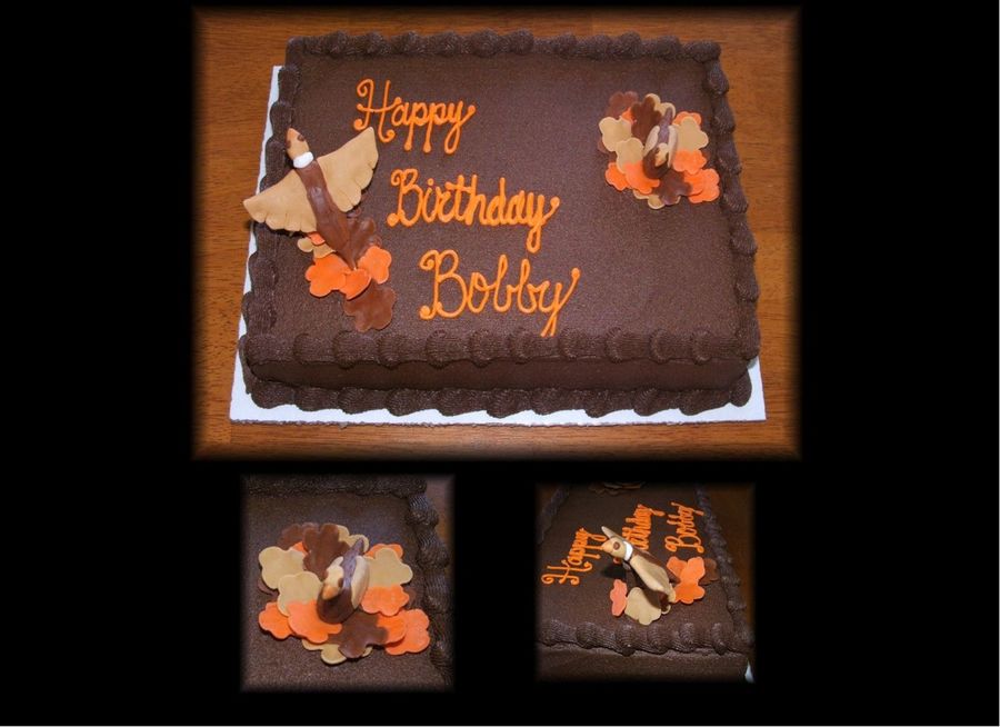 This is a yellow cake with chocolate Dreamwhip Buttercream. The pheasants and leaves are made of MMF. Thanks for looking!