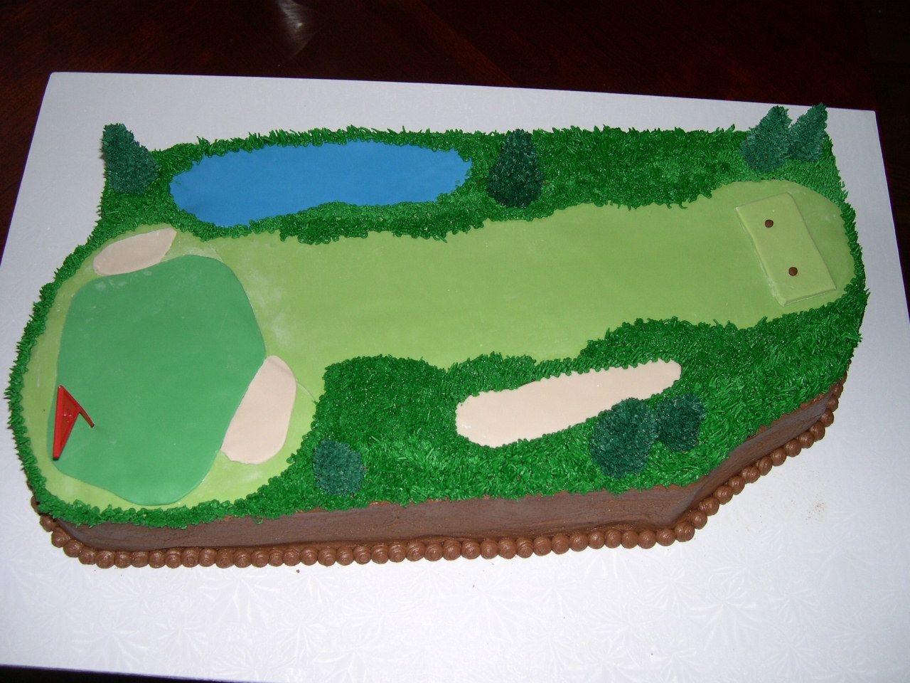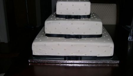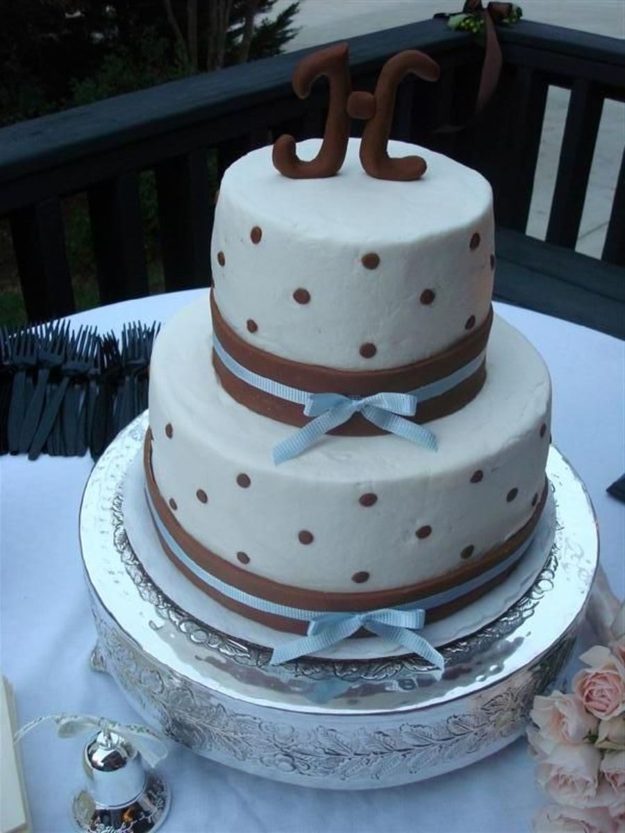I made this for my best friend's wedding. BC icing with fondant dots, brown ribbon, and H topper.