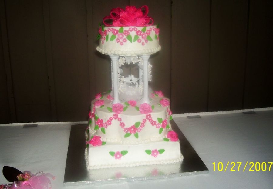 12 ' petal stacked on 12" square tiered with 8" round. gumpast flowers and leaves with fondant bow. made my Granny Debbieand myself. flowers and bows have been dusted with rose pink pearl dust. Buttercream frosting coverd with white pearl. The lighting doesnt show the sparkle and pearl too well.