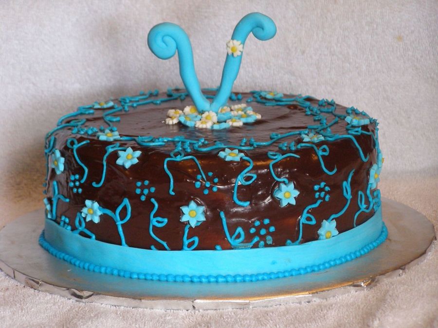 This is a cake that I made for my Mom's birthday. She loves chocolate so it's a chocolate cake w/ chocolate buttercream, then covered with chocolate ganache. The flowers and the letter are MMF. I was inspired by other cakes here on CC. Thanks for looking!
