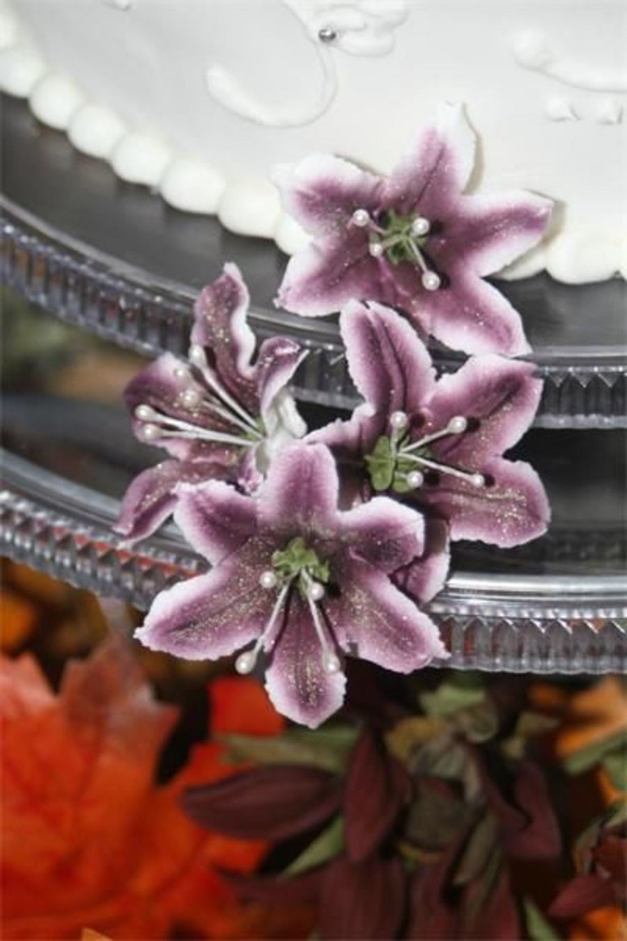 This was my first attempt at a real cake shaped like my daisy cake. I decided it is a unstable design. It was really leaning forward by the time they did the cake cutting ceremony. I was praying they would hurry up before it fell over! :) I used 2 inch styrofoam to make the tiers extra tall. Fondant with royal icing lillies.