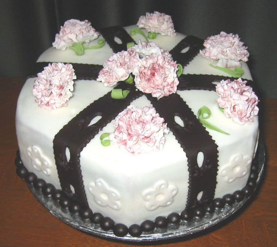 Wilton Fondant & Gumpaste. Last cake completed in class. Black fondant trim and burgandy tinted gumpaste carnations