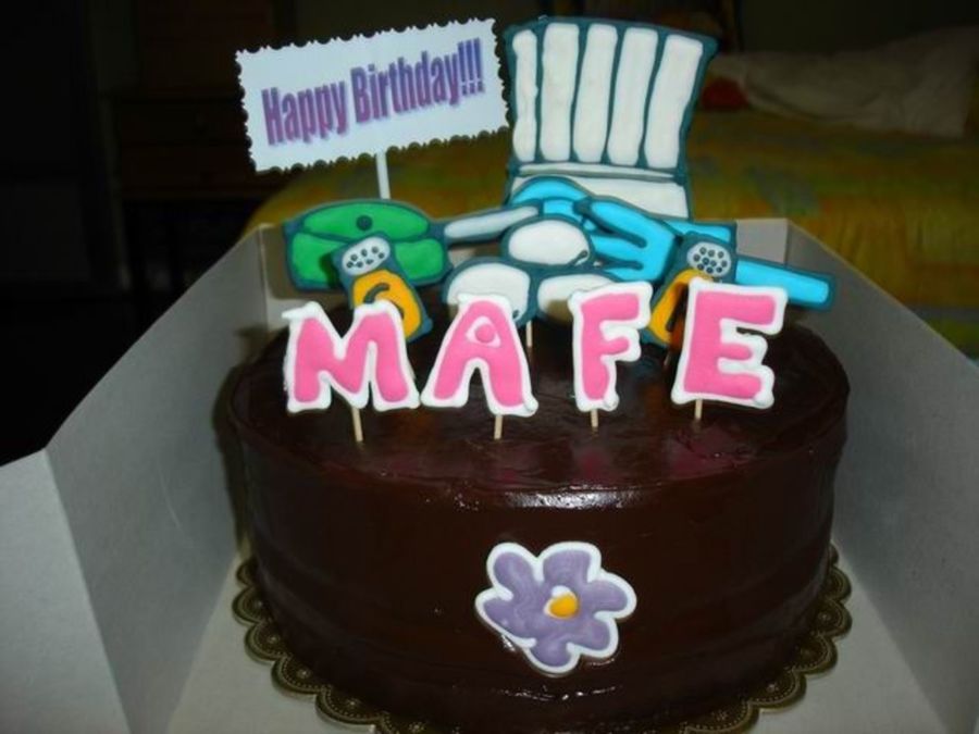 chocolate fudge cake with chocolate filling...made this one for my sister in law who is a chef...idea of course is from a member here...thanks so much for the idea =) should've pushed the decorations more on the cake though.