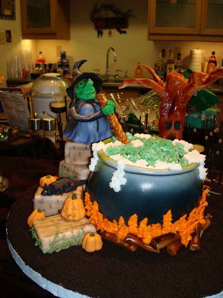 This cake was for a friend whose kitchen was Witch Themed for a Halloween Party. The cake (the cauldron) was a lemon cake with an orange marmalade filling. The rest of the decorations were fondant and buttercream icing. The board was covered with crushed Oreos to look like dirt.