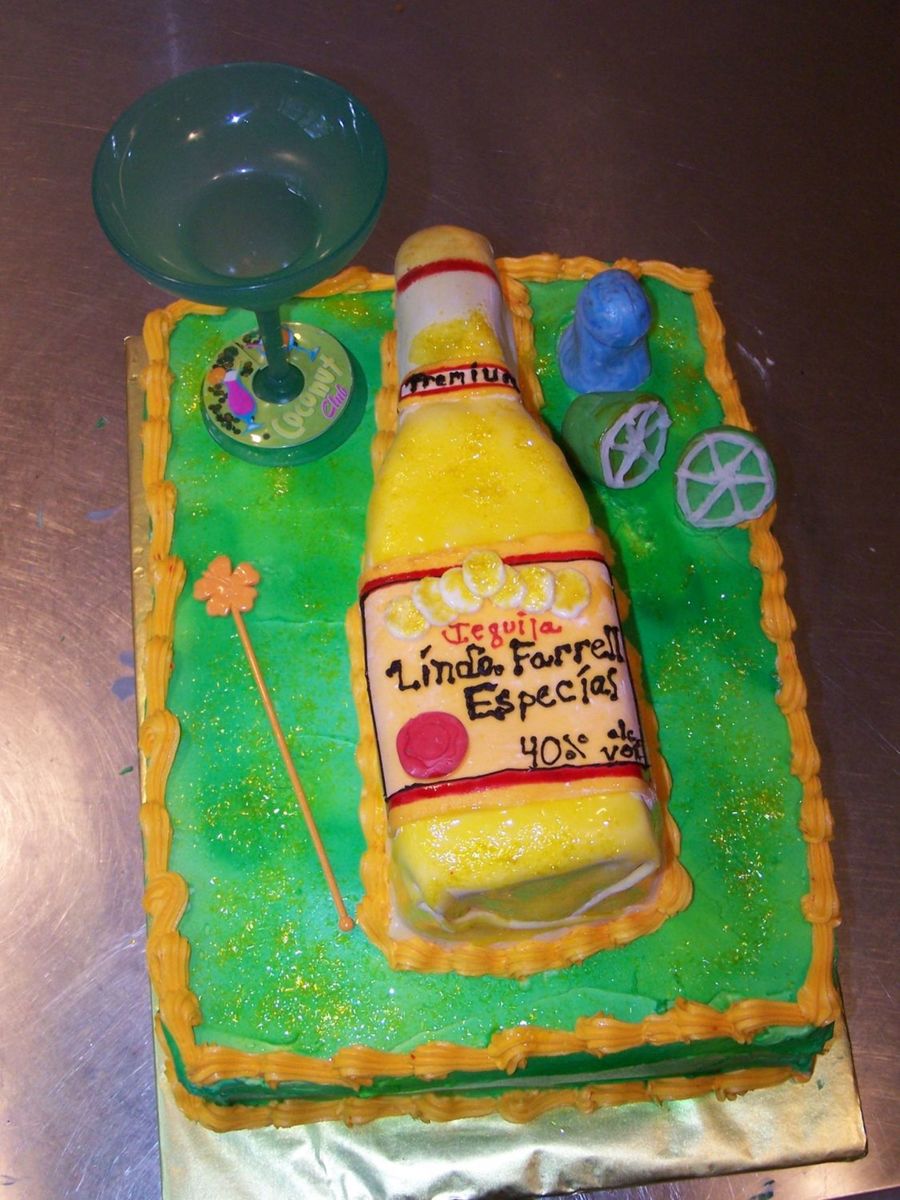 Made this for my girlfriend's 40th. Used a Jose' Quervo bottle for inspiration(she loves it!). The bottle 1/2 pound and 1/2 yellow so that it would have some substance to it. It's covered first in buttercream and them fondant. the details were very time comsuming but I had fun adding each to make the cake a unique gift for a dear friend. The glass is plastic filled with a lime jello shot. Everyone at the party loved the cake. Thanks for viewing!