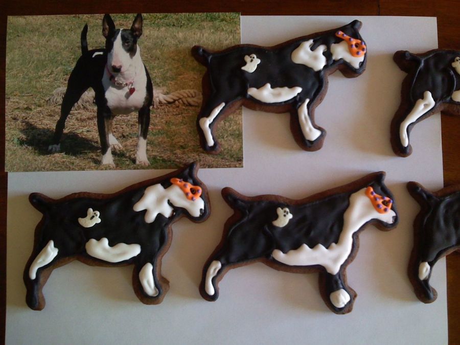 My bull terrier, Eleanor, is well known around the neighborhood. She has a white spot on her back that I turned into a ghost. These Halloween cookies are for her vet, trainer and daycare group. Kitchengifts.com chocolate cutout cookie with Antonia74's icing. Thanks for looking!