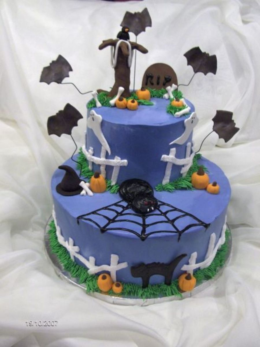 Made this cake with Nicole211, top tier is white cake/pumpkin spice mousse, bottom tier is choc cake/PB cheesecake mousse. Covered in whipped cream frosting with fondant accents