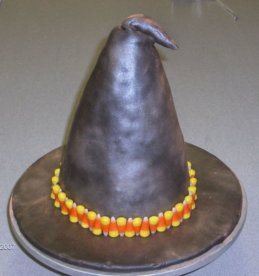 Made with Nicole211 as a donation to support battered women. Cake was choc w/raspberry filling. 7x3", 6x3" & 5x3" stacked and carved. Covered in chocolate fondant dyed with some black and then dusted with silver luster and orange petal dust. The hat brim is a cake board covered in fondant and candy corns as an accent. TFL!!!