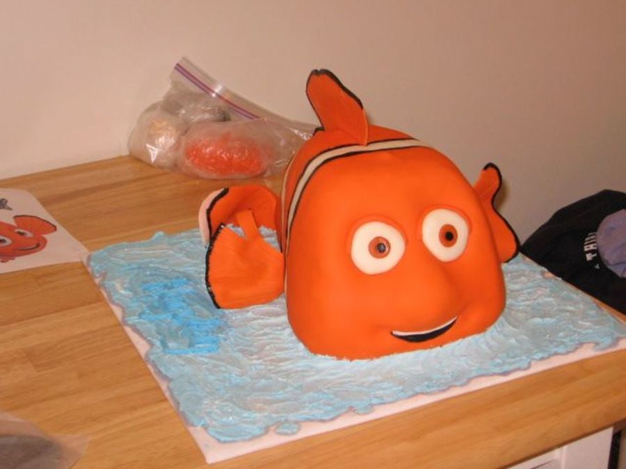 12x18 chocolate cut in half and stacked and an 8x12 on top of that. Carved to nemo shape. Covered in MMF. Covered piece by piece, orange then white, then orange etc. All fins also done in MMF.