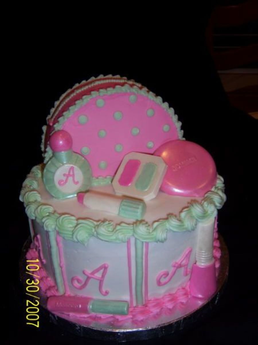 Here's my take on a make up cake. 8" Chocolate with bavarian cream, and 6" "bag". All decorated with BC. Make up is chocolate molds and dusted with Pearl. Thanks for looking.