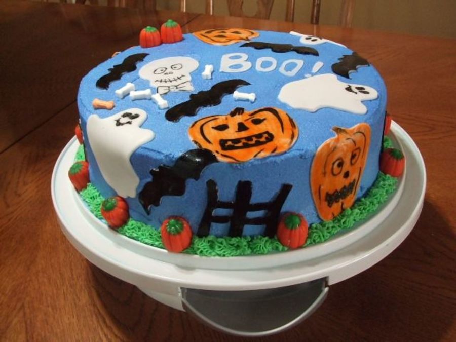 My first Halloween cake! 10" pan, buttercream and fondant accents, the pumpkins in the borders is from my sons Halloween candy. cake is vanilla. Got inspired with other Halloween cakes from CC.