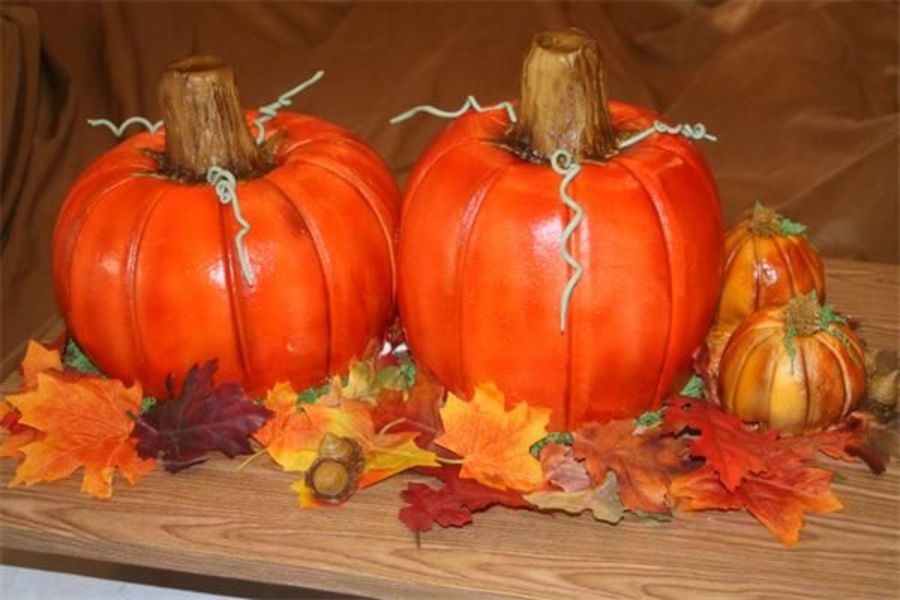 For a halloween party. Buttercream, airbrushed. Short pumpkin- bundt pans, tall pumpkin- 2 pyrex cassaroles+2 8inch rounds, small pumpkins- mini wonder pan. Heating core for stems. Buttercream acorns.