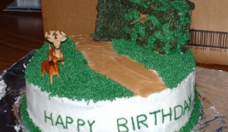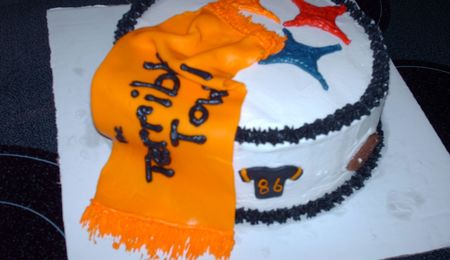 My daughter wanted a soccer theme for her birthday. The colors of her team were orange & black. The icing is BC. I put the cakes on the silly feet cake plate and iced the feet to match the colors of the ball.