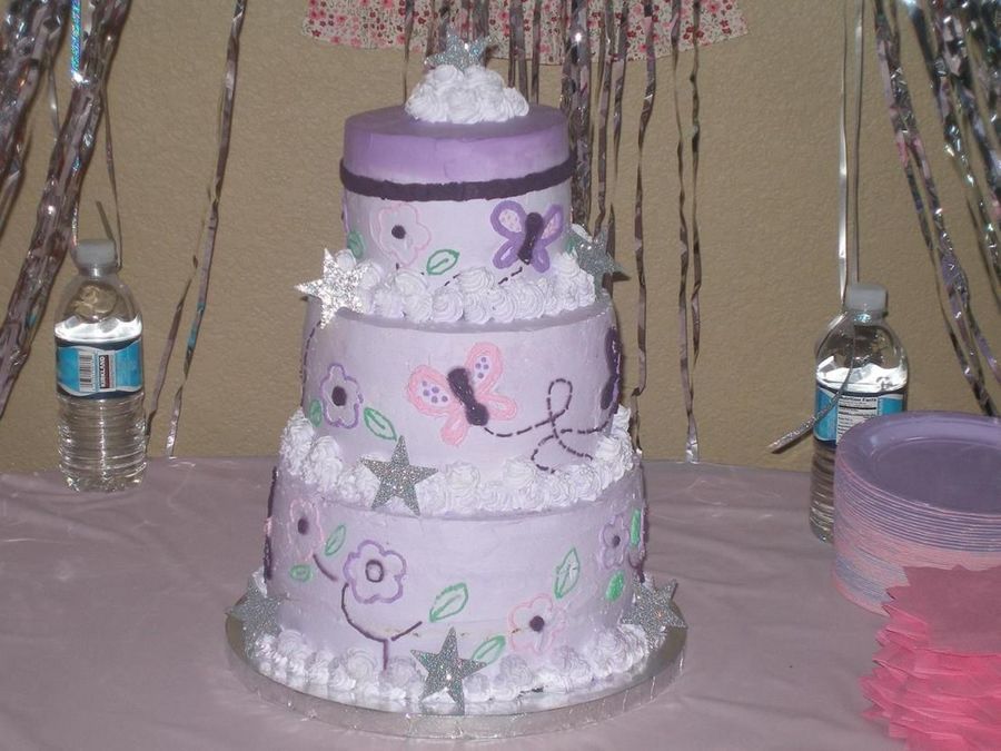 I made this cake for a friend of my mom. It's one of my first "real" cakes I've made outside of my cake classes. 6" white/custard, 8" chocolate/banana, 10" white/strawberry cakes. Non dairy whipped cream topping. I made this to match the nursery bedding the MTB chose. All hand piped. The dark purple band on the top tier is a little crooked which really bugs me, but overall I think it turned out well. Also, the MTB had stars as the cake table decor so I added sparkley stars and clouds.
