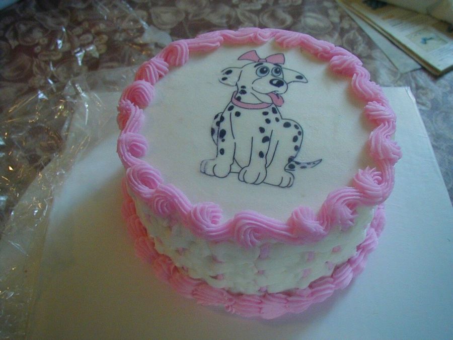 This cake was made for a Volunteer Fire Dept Benefit for auction to help pay funeral expenses. With this cake was a gift certificate for a 20 serving cake of their choice. It was a white cake with b/c icing with basket weave sides. I felt like the dalmation was appropriate for the fire dept and the pink ribbon represents the person who expired.