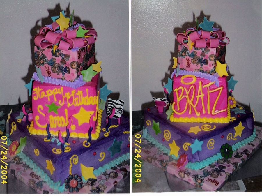 This cake was made for my Daughters 6th B-Day. Bottom cake was chocolate/chocolate filling next tier was strawberry cake with pineapple filling & top tier was marble cake with chocolate filling & covered with bratz theme ediable paper stars were chocolate fondant