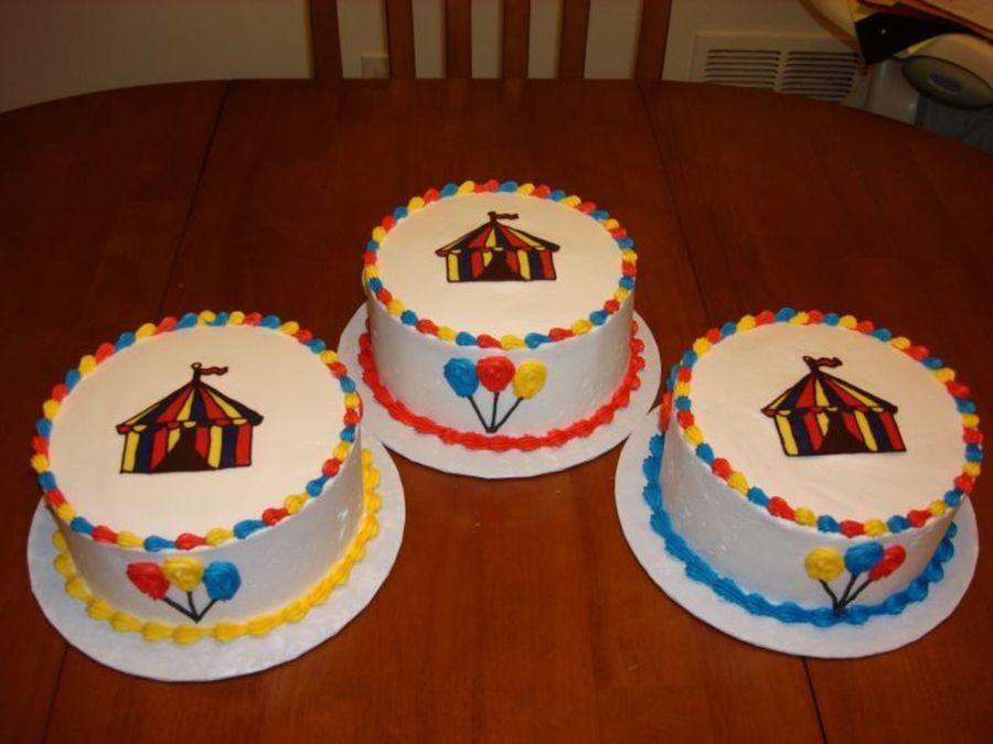 Circus themed cakes for our church's Family Fest cake walk booth. Tent is chocolate transfer.