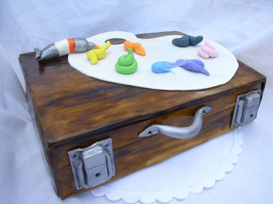 An art box with paint and palette. The box is painted fondant and the palette is gum paste. Paints are fondant.
