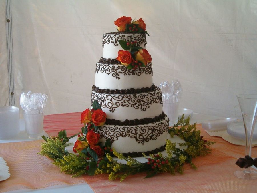 Can I just say--what a lovely cake! I love the scroll work, love how it's only on the top part of the tiers, and those flowers complement the cake so wonderfully. Very eye-catching.
