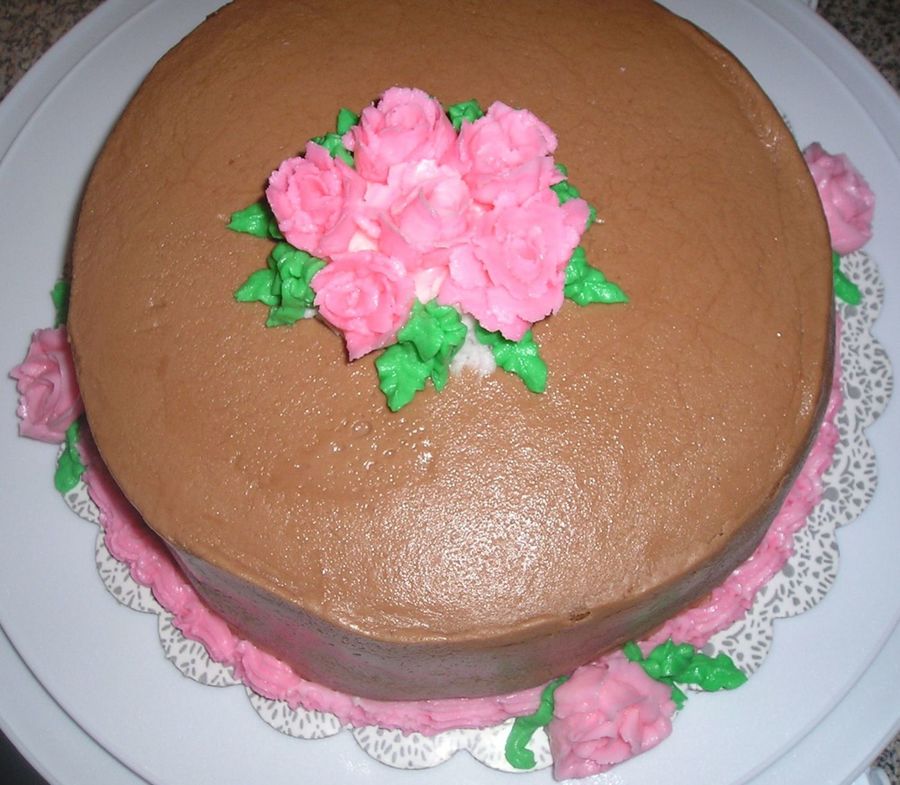 I made this in a Wilton 1 course. The buttercream is a little sweet for me, so I added cocoa powder. It makes it a more chocolatey flavor, and less sweet. It also looks nice with the pink roses.