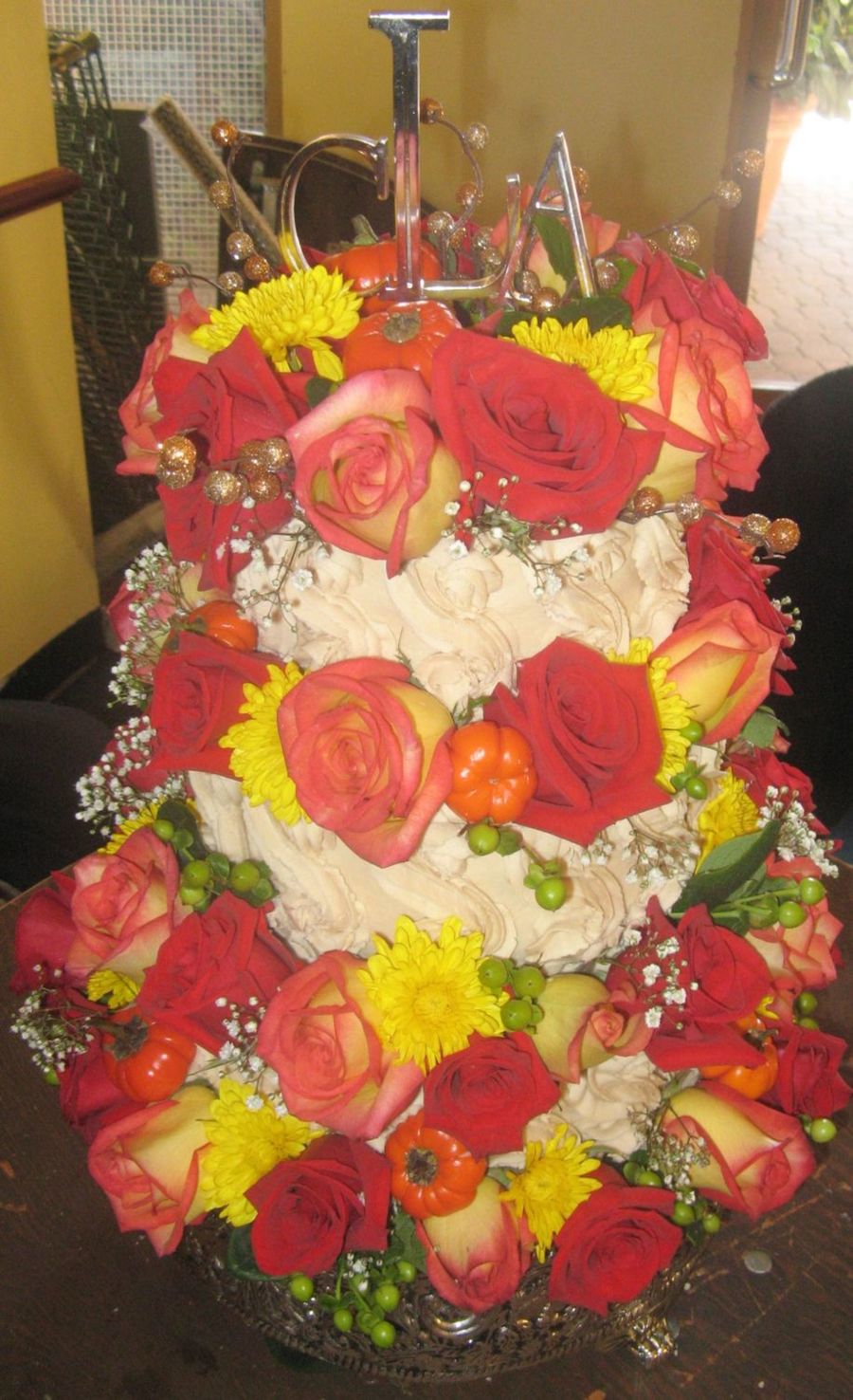 It is hard to see the cake for all the roses but it looks beautiful! Love the colors she chose for the flowers!