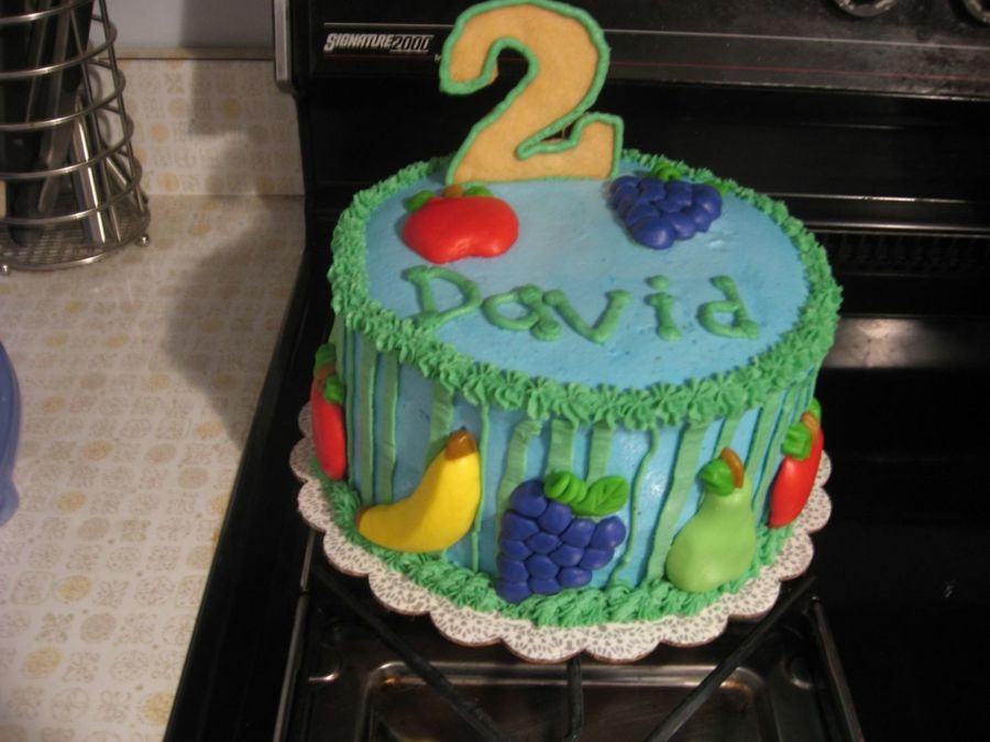 Chocolate cake iced in buttercream with fondant fruit accents. The 2 is a sugar cookie.