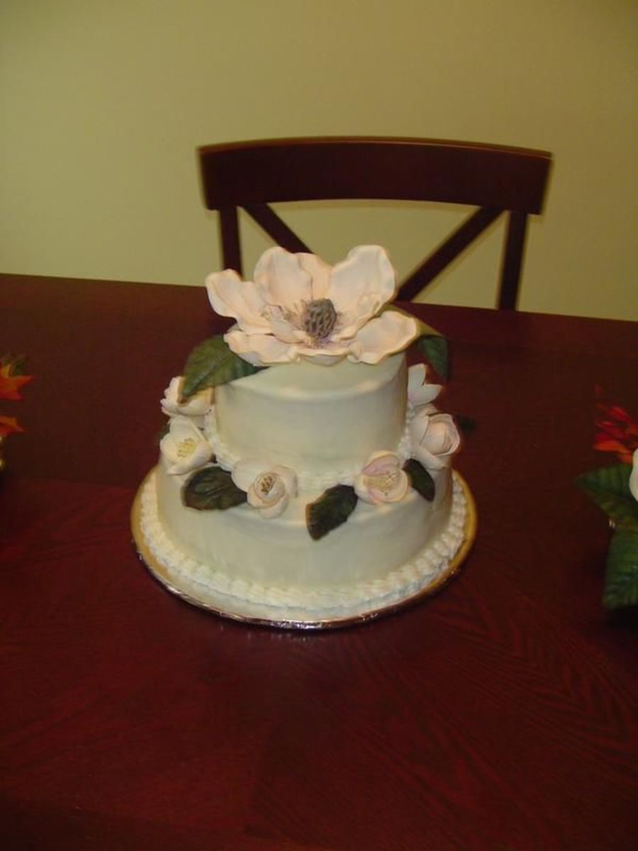 This was a cake for a southern themed wedding. It was a red velvet cake with cream cheese icing and topped with an artifical magnolia and buds.