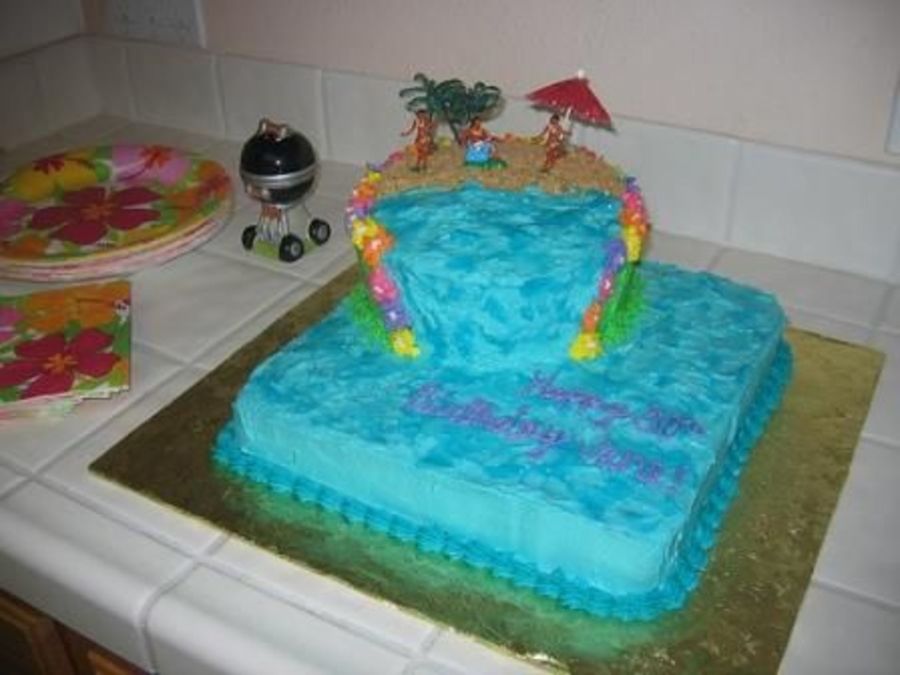 This is done in all Buttercream. I got the idea from someone on here. Can remember their name, but thanks! This was my first attempt to do anything bigger than a sheet cake. It was for my grandmas 80th birthday luau. She loved it!