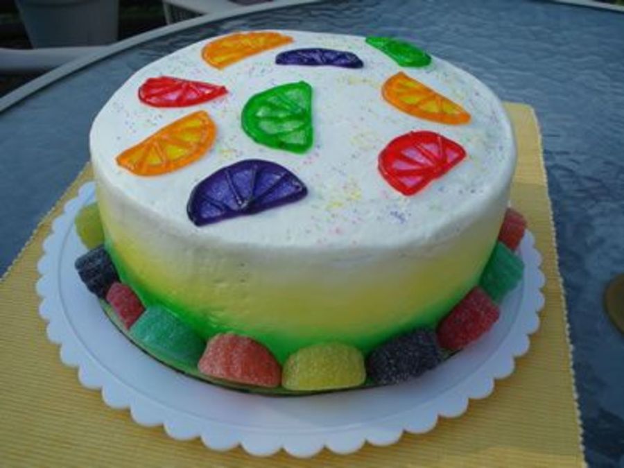 3-layer citrus cake (lemon, orange, lime) with lemon icing. Fruit made with decorating gel and colored sugar. Fruit slice candy border.