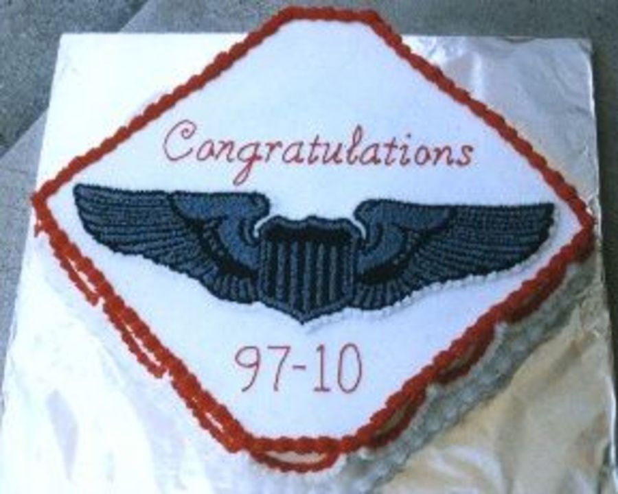Cake frosted in buttercream, wings in royal frosting. Wings measures over 16 inches across. Did this cake for my husband's graduation from pilot training.