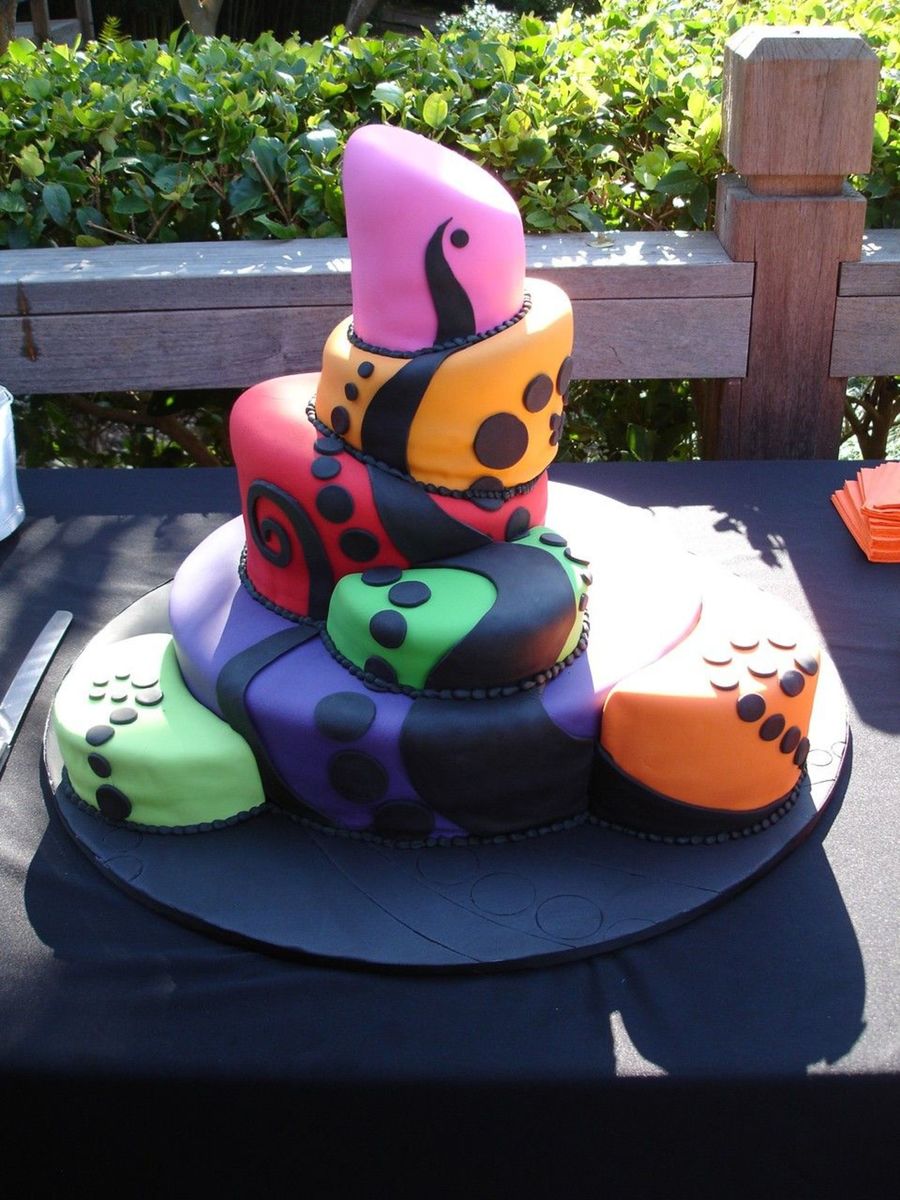 Very, very, VERY cool. 8) I love the bright colors, and how your continue the same "swirl" up the entire cake. So eyecatching! I love it!