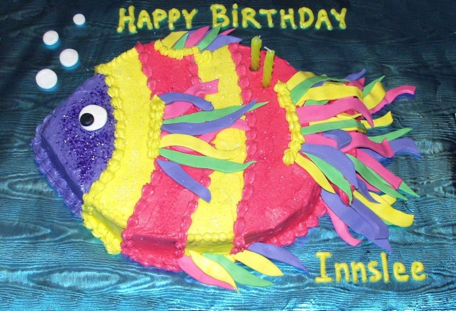 Brightly colored buttercream covered carved oval sheetcake. Fondant strips for fins, eyeball, and bubbles. Fresh banana cake with vanilla buttercream icing. Sugar sprinkles for some sparkle. Blue covered cakeboard to mimic water. A fun cake to make! Rendition of the Wilton 2007 version using a shaped cake pan. I don't do stars!